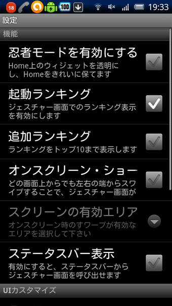 Gesture Launcherは設定からさらに細かいカスタマイズが可能です。「ジェスチャー認識」を高く設定すれば、ジェスチャーの読み取りが厳密になります。ジェスチャーの軌跡も好きな色に変更できます。「起動ランキング」にチェックを入れておけばジェスチャー画面であらかじめ起動履歴の多いアプリがアイコンで表示されるので、直接タップして起動することもできます。